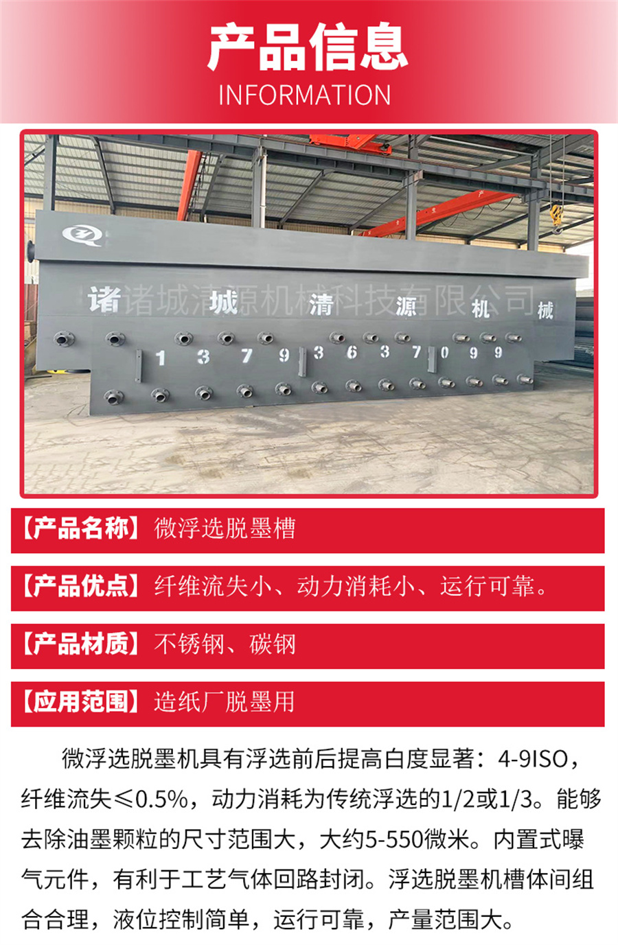 微浮選脫墨機(jī)具有浮選前后提高白度顯著:4-9ISO,纖維流失≤0.5%,動力消耗為傳統(tǒng)浮選的1/2或1/3。能夠去除油墨顆粒的尺寸范圍大,大約5-550微米。內(nèi)置式曝氣元件,有利于工藝氣體回路封閉。浮選脫墨機(jī)槽體間組合合理,液位控制簡單,運(yùn)行可靠,產(chǎn)量范圍大。