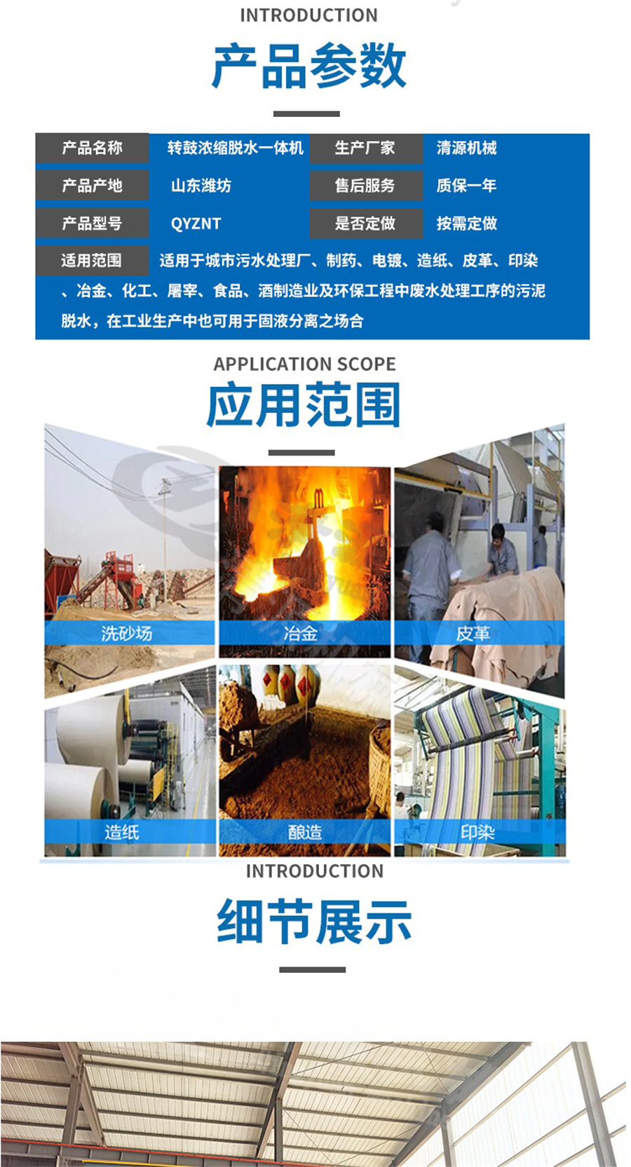 諸城清源機(jī)械科技有限公司生產(chǎn)的轉(zhuǎn)鼓濃縮帶式污泥脫水一體機(jī)處理前含固體顆粒含水率:99.4%-98%處理后的含水率:小于80%(可以直接運(yùn)輸填埋或焚燒)。